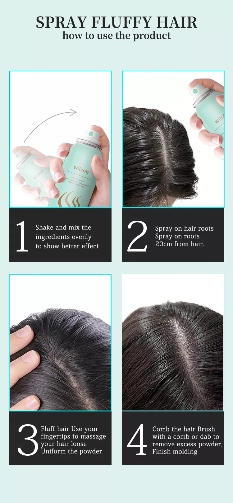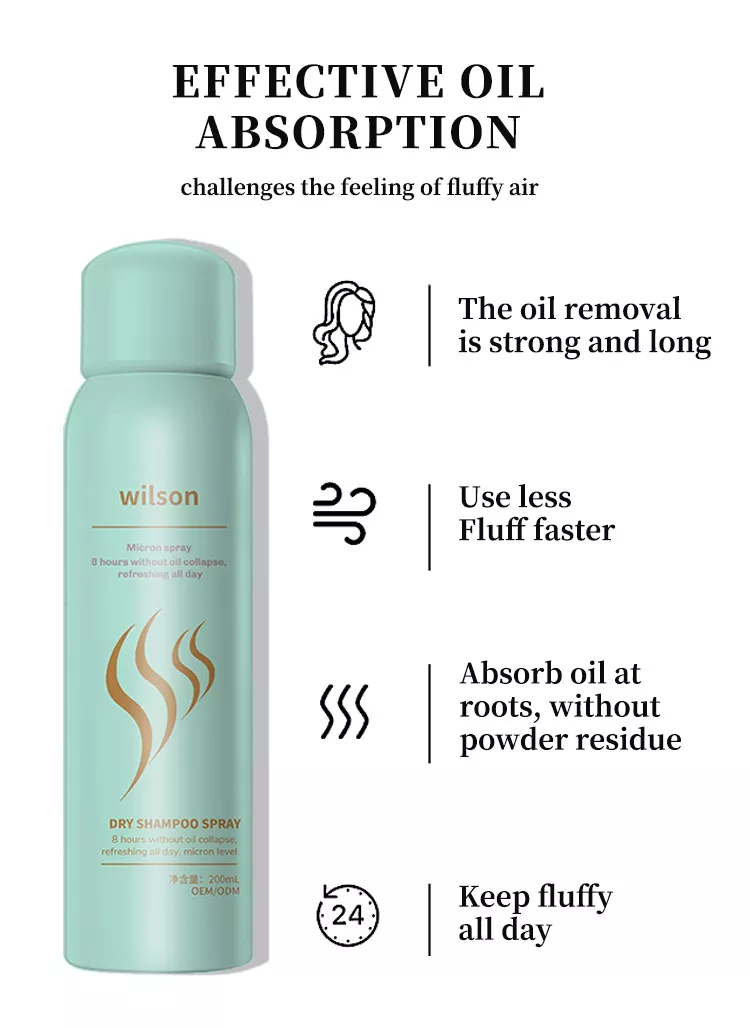 Wilson Instant no-wash cool dry shampoo spray has rescued many oil head temporarily go out can not wash the hair problem, the main raw material is rice starch, starch has porous structure, adsorptivity, is a common hygroscopic adsorption raw material, can effectively absorb excess oil on the scalp and clean the hair dirt, spray and add some surfactant and electrostatic components to facilitate the removal of products from the hair. Pakiramdam sariwa at natural pagkatapos gamitin.